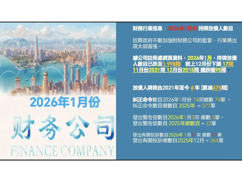 基於公司註冊處公開數據,2026年1月香港財務行業呈現「監管收緊、行業洗牌」的核心特徵,具體趨勢與風險可從以下數據拆解: